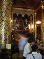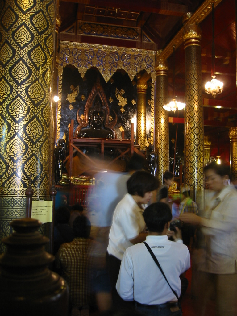 着いた翌朝、勝手に「私のお寺」に決めているヤイ寺への御参りに行く。このお寺にはタイ国内でも一番美しいと賞されている仏像が安置されている。丁度、500年に一度の金貼り(ปิดทองと言うらしい)の最中らしく、滅多に見られない黒光りした御本尊を拝む。2, 3日後には金が貼られ、国王の息子?がやって来て行事が行われるらしい。
