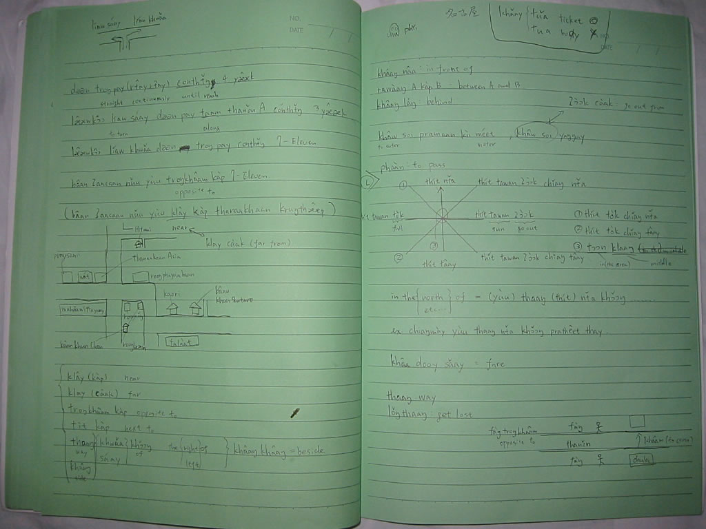 基礎1が始まってから約一週間経った頃、単語帳の必要性を感じて以来、テキストとノートに出てきた新出単語を書き取っては覚える作業をしていたので単語数は随分増えた。日本語を言われればタイ語の単語が大体出てきたし、その逆も大体できたと思う。しかし、それらは実際の会話では使えない大学受験用のタイ語であったかもしれない。タイ人の友人との会話は積極的に行っていたが、会話はどうしても簡単な単語・言い回しに流れがちであった。つまり、習ったばかりの新出単語を使うよりは、それを優しい言葉に置き換えて発音するほうが楽なので、例えば椅子という単語を知らないときには「座る物」と説明したり、通常は「初回」と言うほうが一般的なのに「第一回目」という表現が簡単なのでそちらを使うことが多かった。